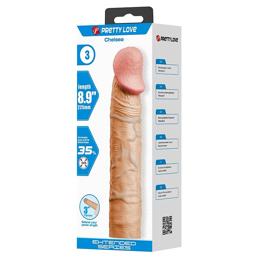 Manșon realist Pretty Love Chelsey, mărime totală 22,5 cm; crește +7,6 cm la penetrare și mărește circumferința până la 35%. Material TPR flexibil, texturat, rezistent la apă pentru contact comod și stârnire intensă.