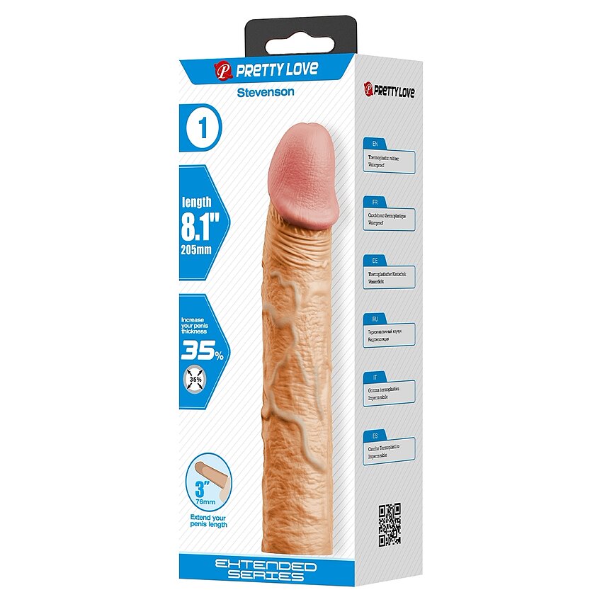Cilindru extensie Pretty Love Stevenson din TPR ultra-realist, lungime 20,5 cm, cu vene texturate și cap rotunjit. Interior moale pentru atingere mare și stimulare. Viguros la apă; colorit maro (flesh).