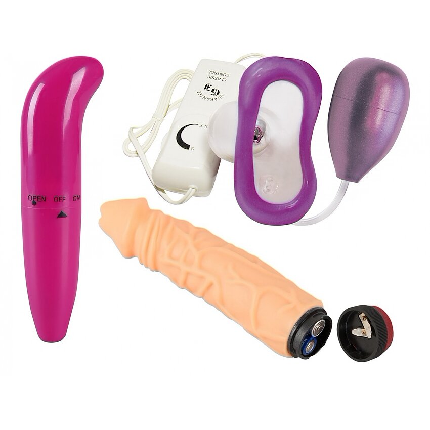 Detalii produse și beneficii: - Vibrator 21cm Big Boy: material PVC moale, inserabil 18,5 cm, diametru 4,5 cm, textură cu vene și cap pronunțat pentru senzație realistă. Elastic dar ferm, cu vibrații multi-viteză controlate la bază pentru a regla robustețea penetrației. - Pompă Aspirație cu Vibrații (roz): cupă cu urmare de suctiune care dezvoltă receptivitatea clitorisului, vibrații integrate și tele-comandă pentru setări comode. Fabricată din ABS și PVC, lungime 6 cm, calibru 2 cm — perfectă pentru preludiu și pentru a facilita contactul orgasmelor. - Vibrator Punct G Mat Obișnuit (roz): corp îndoit pentru stimularea precisă a punctului G, din ABS, extindere nealterată 12,5 cm (inserabil 6 cm), diametru 1,5–2,7 cm. Vibrație puternică, compact și versatil; folosește baterie AA (neinclusă).