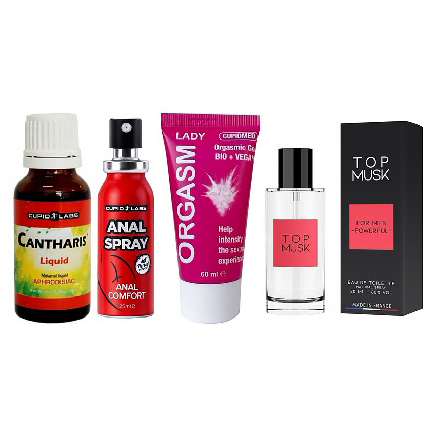 Set complet pentru nopți pasionale: confort pentru explorarea anală, stimulare și creștere a libidoului feminin, plus magnetism masculin. Folosiți spray-ul pentru relaxare, gelul pentru sensibilizare, picăturile pentru potență și feromonii pentru atracție.