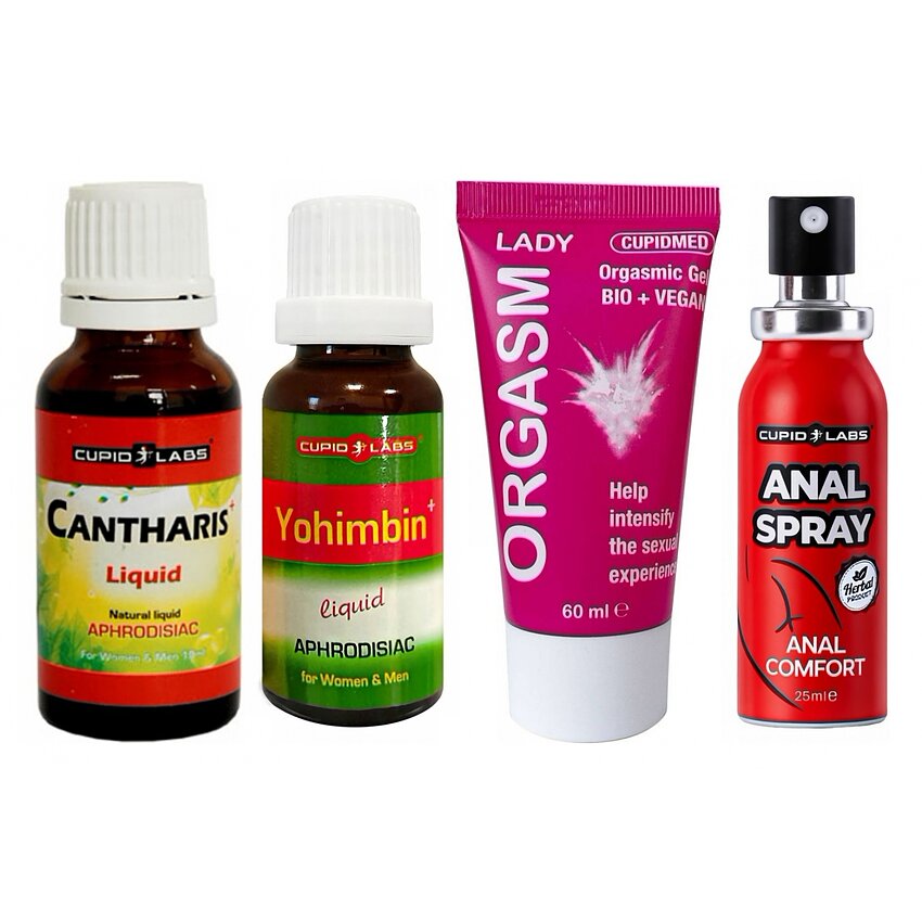 Ce asigură fiecare componentă - Atomizator desensibilizator anal (Cupid Labs, 25 ml): realizat pentru a relaxa sfincterul și a facilita penetrarea cu mai mult confort. Foarte util cuplurilor care vor să exploreze în siguranță, dând o intrare mai netedă și reducând teama asociată. - Gel Plăcere sexuală maximă Lady (Cupid Labs, 60 ml): textură plăcută, lipsit de parfum, cu soluție hipoalergenică care amplifică sensibilitatea zonelor sexuale prin efecte de încălzire și furnicătură. Perfect pentru preludiu și stârnire locală, sporește receptivitatea și intensitatea senzațiilor. - Picături Cantaridă Plus (20 ml) și Yohimbin Drops (20 ml): două variante de stimulente naturale pentru creșterea poftei și a vigorii. Cantharis activează apetitul erotic și energie rapid, iar Yohimbina ajută circulația locală și poate amplifica răspunsul sexual. Ambele se pot administra în lichid sau sub limbă conform instrucțiunilor pentru rezultate în circa 30 de minute.