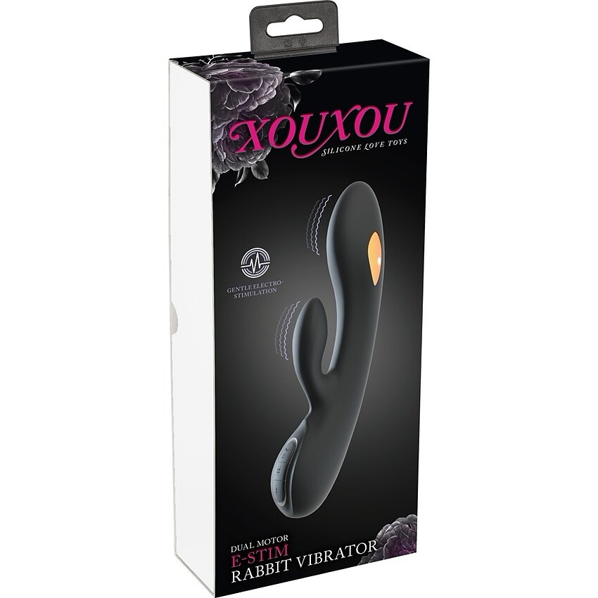 Stimulator iepure XOUXOU care împreunează impulsuri electrice (E-Stim) cu vibrații concentrate pentru stârnire dublă, într-un compus ergonomic și discret.