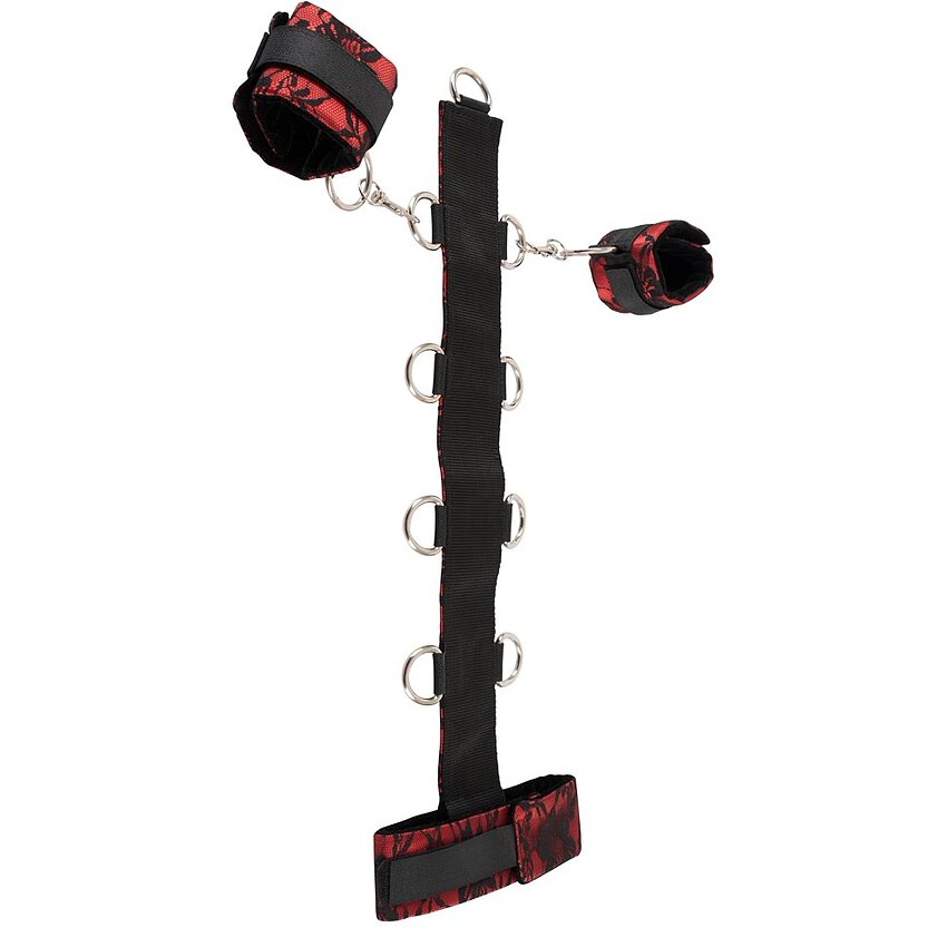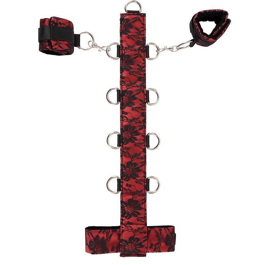 Beneficii și atribute: - Design elegant: satin roșu combinat cu dantelă neagră - Partea interioară din catifea pentru confort la purtare - Prindere reglabilă cu velcro pentru ajustare precisă - Cătușe cu carlige rapide pentru montare/demontare facilă - Material 100% poliester: durabil și fără greutate de întreținut