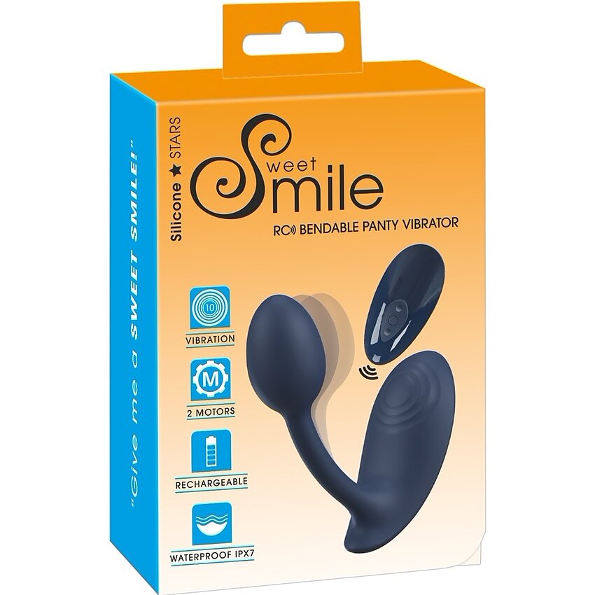 Vibrator pentru chiloți discret, Panty Flexibil Sweet Smile: 2 motoare pentru stimulare internă și clitoridiană, 10 moduri de vibrație, telecomandă până la 5 m, cu acumulator USB. Silicon moale, stil pliabil și ambalaj eco-friendly.