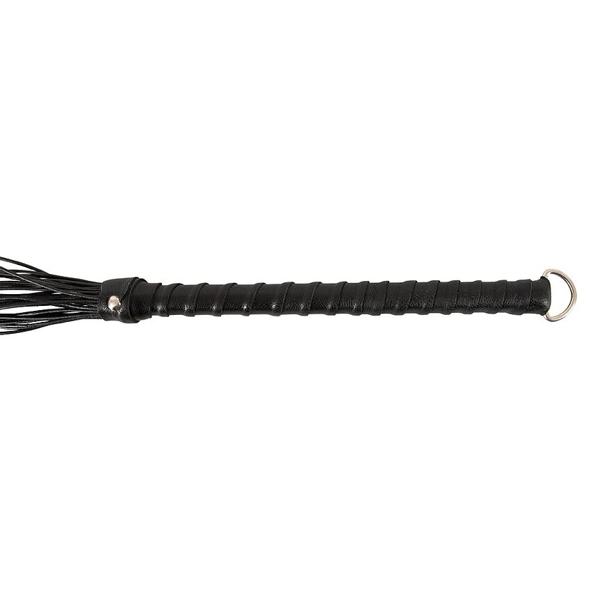 Flogger ZADO din epidermă naturală, 70 cm. Curele rotunde subțiri cu vârfuri ascuțite, mâner îmbrăcat și inel pentru agățare. Recomandat pentru plesnire ușoară și control precis.