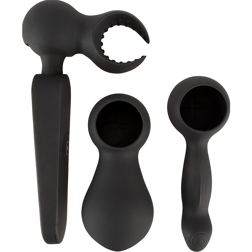 Setul include trei accesorii moi interschimbabile: dildo texturat (16 cm total, inserabil 10,5 cm, diametru max. 2,8 cm), masturbator închis cu texturi (13,5 cm, adâncime inserabilă 8,5 cm) și masturbator deschis elastic (11,5 cm, calibru 3,8 cm). Accesoriile se montează lezne și sunt gândite pentru masaj extern și utilizare intimă.