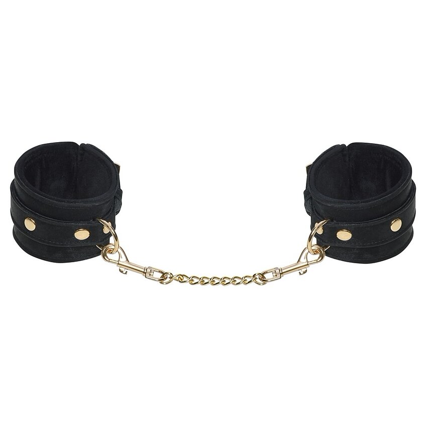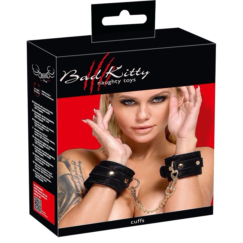 Cătușe elegante Bad Kitty, finisaj catifelat întunecat și accente aurii. Reglabile pentru încheieturi 22–28 cm, cu catarame și lanț auriu detașabil de 21 cm. Materiale: poliuretan, metal și poliester; margini cusute pentru durabilitate.