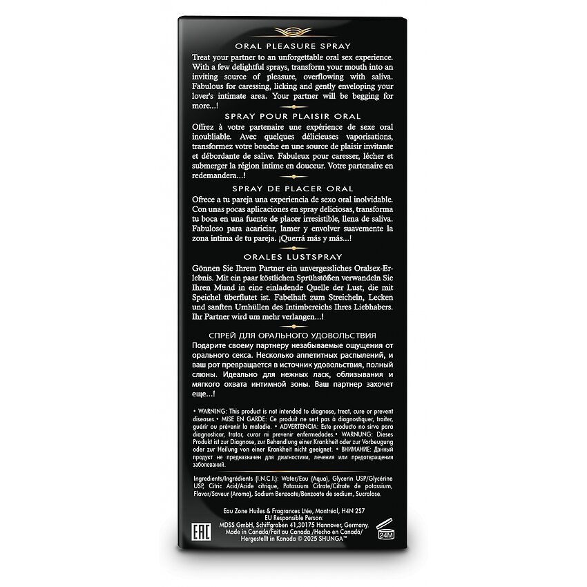 Mod de folosire și siguranță: - Pulverizați 1–3 pufuri în gură, apoi continuați cu săruturi, lingere sau mângâieri fine - Evitați raportul cu ochii - Nu consumați în cantități mari - A se păstra la temperatura camerei, ferit de lumină intensă - Verificați părțile componente în cazul alergiilor