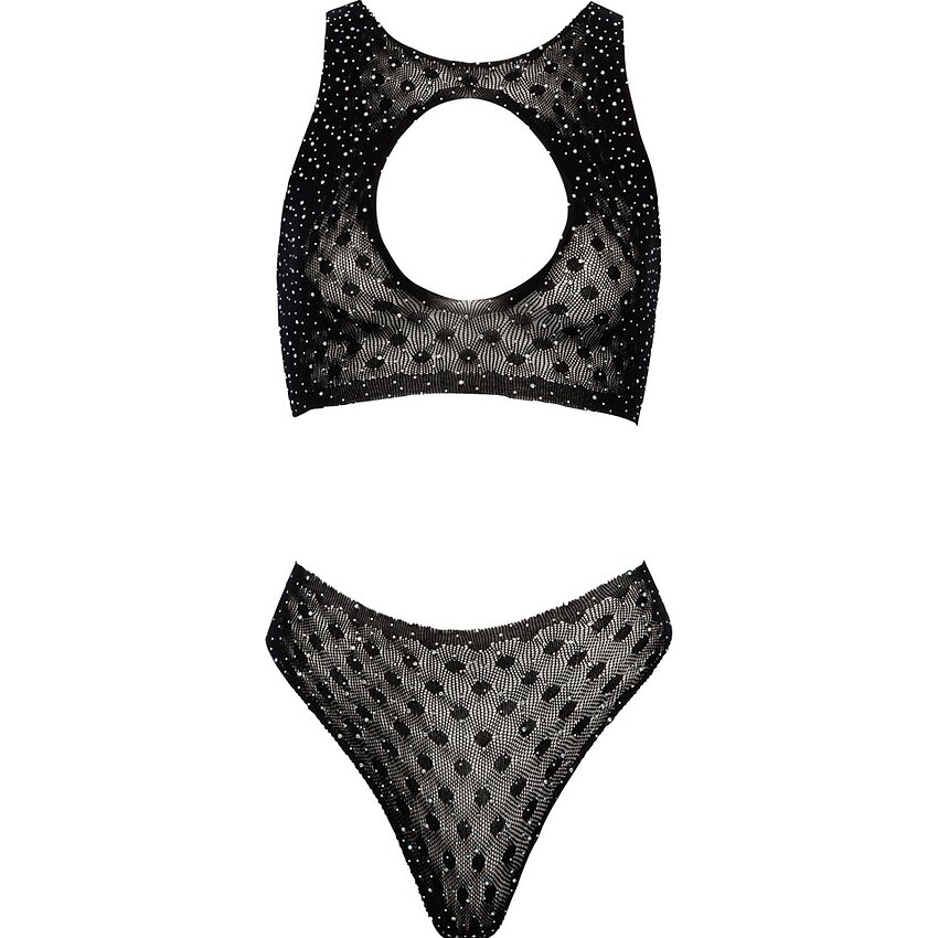 Set Fantezie Cottelli: top semitransparent cu decupaj la decolteu şi tanga, cele două acoperite cu strasuri mari. Material elastic, lipsit de cusături evidente, foarte confortabil. Mărime universală S-L. Compoziţie: 93% poliamidă, 7% elastan.