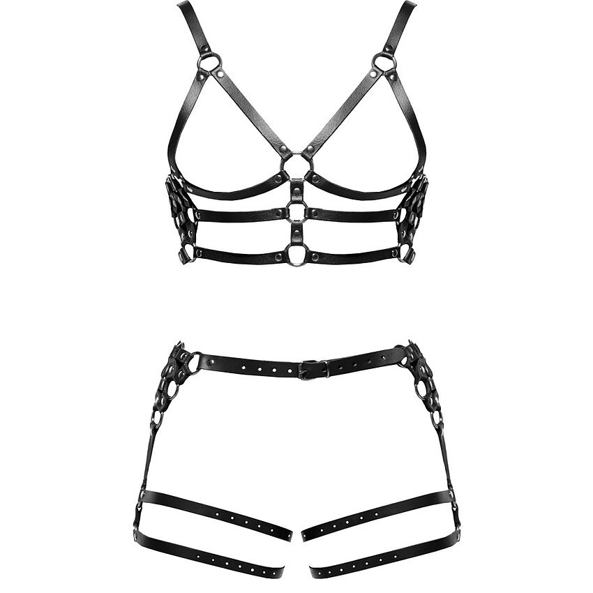Set hamuri din piele ZADO, reglabile, negru: ham pentru piept și șold cu chingi fixe pe coapsă, catarame metalice pentru ajustare și prindere sigură. Tegument split (cowhide), tăbăcită fără crom, acoperire poliuretanică; confort și fixaj stabilă.