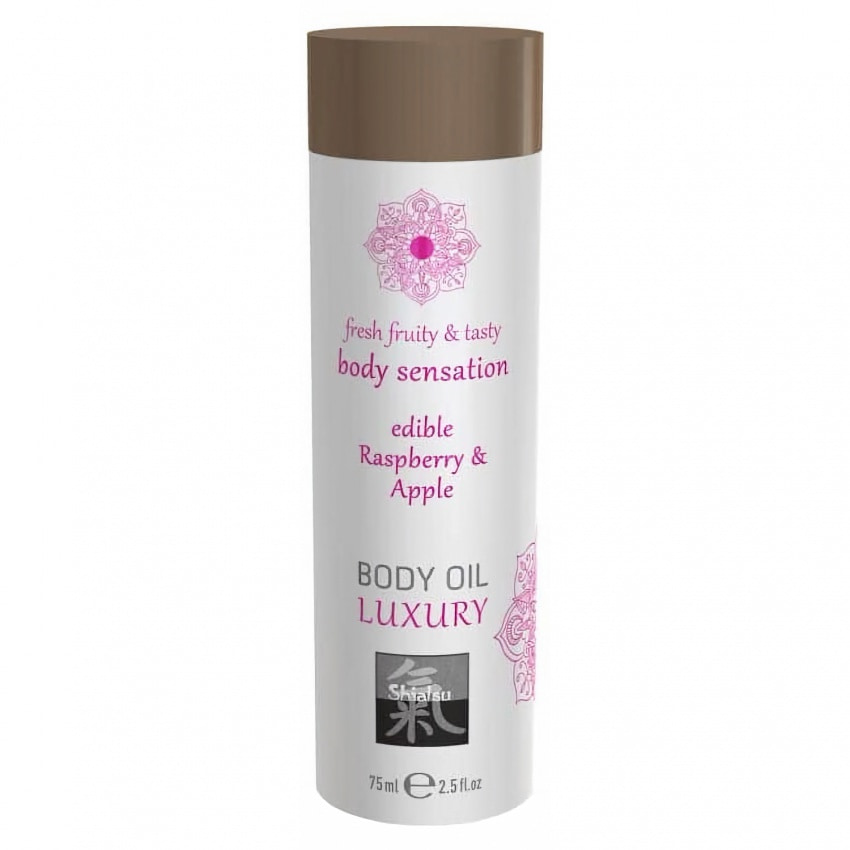 Ulei de corp comestibil Shiatsu zmeură și măr, 75 ml. Textură fină, gust plăcut, ideal pentru masaje în doi. Se absoarbe fără greutate și se îndepărtează cu apă caldă și săpun. Doar pentru adulți.