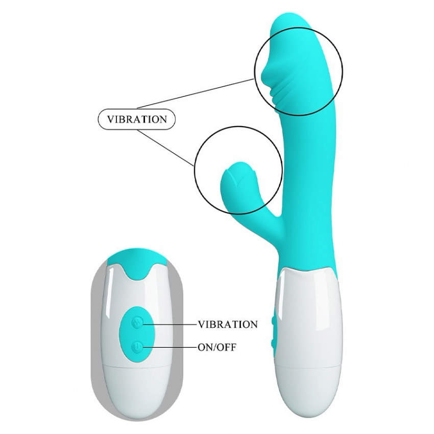 Vibrator Pretty Love Snappy, rabbit pentru G și clitoris, 30 funcții, silicon catifelat, trainic la apă. Motor puternic, control simplu, alimentare 2 x AAA. Design flexibil pentru păstrarea intimității și stârnire combinată.