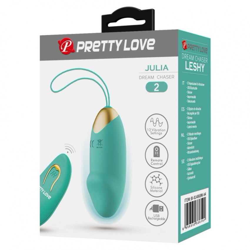 Ou stimulator Pretty Love Julia — compact şi discret, cu 12 feluri de vibraţie şi telecomandă wireless. Suprafaţă din silicon, netedă; excelent pentru stimulare punctuală, uşor de depozitat.