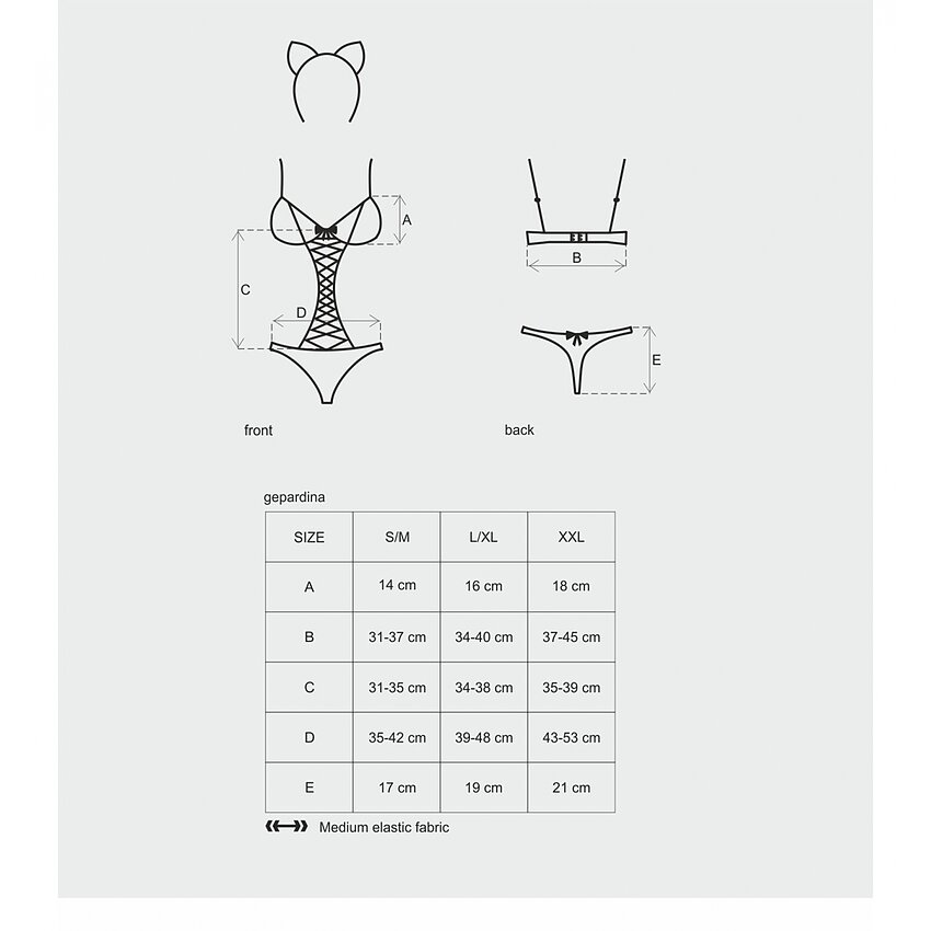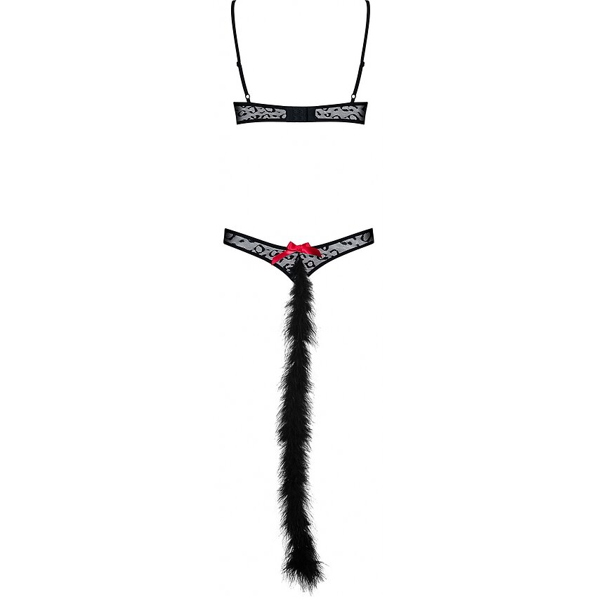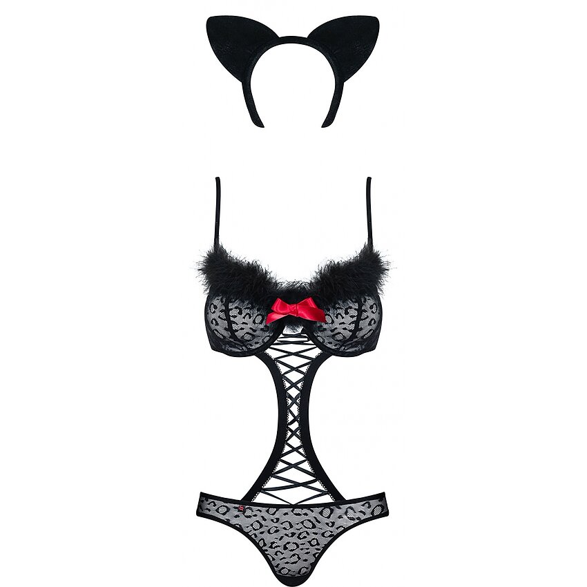 ținută sexual este confecționat din tul fin. Are cupe întărite, acoperite în fracțiune de sus cu puf negru. Bretelele sunt reglabile. Sutienul și bikini-ul sunt legate pe abdomen, ce dă un farmec aparte produsului. Panty-ul are atașată la spate o coadă din puf, ce se poate desprinde. Kitul conține și bentiță cu urechi. Bunul este fabricat dintr-un material elastic si se potriveste marimilor S si M.